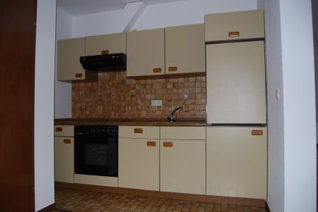 Wohn – und Schlafzimmer mit Küchenzeile, Dusche, Flur, Balkon, Abstellraum, Keller.