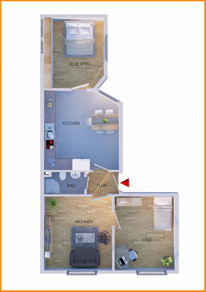 Es verteilen sich auf 73 qm ein Wohnraum und ein Schlafraum, ebenso wie ein Büro oder wenn Sie mögen auch ein Ankleidezimmer.