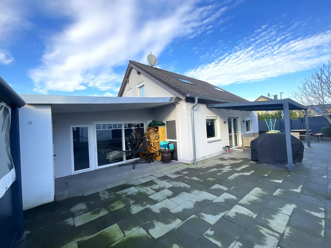 Der Gartenbereich ist pflegeleicht angelegt. Ein Stück Rasenfläche und die großen Terrassenflächen laden an schönen Tagen zum Entspannen und Beisammensein mit Freunden ein. Nach Süden ist die Terrasse überdacht. Durch die Konstruktion aus Doppelstegplatten und Aluminium scheint dennoch reichlich Tageslicht in die dahinterliegenden Räume.