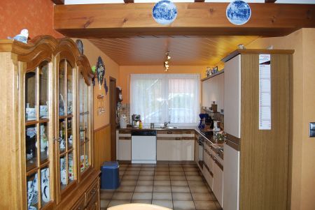 Erdgeschoß: Windfang, Gäste WC, Wohndiele mit EBK und Essbereich, Speisekammer, Wohnzimmer mit Kamin und Zugang zur überdachten Terrasse.