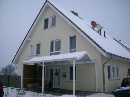 auf einem 225 m² großen Grundstück erbaut. Die ca. 120 m² Wohnfläche verteilen sich auf 4 Zimmer, Küche, Bad und GWC. Zur Doppelhaushälfte gehören ein Carport und eine Terrasse mit Markise. Die DHH ist vollunterkellert.