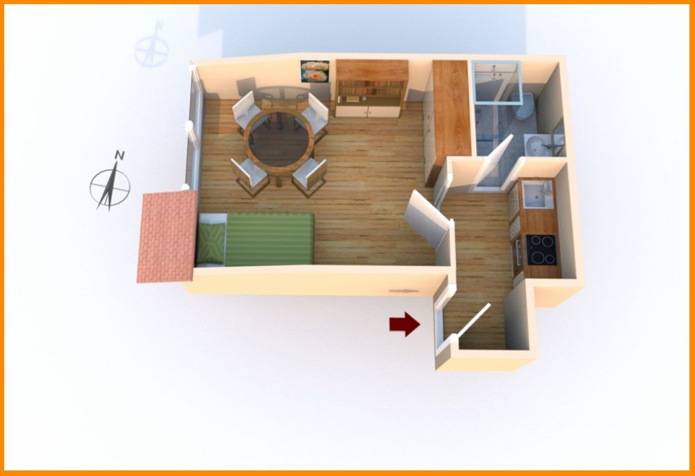 In der Diele ist ausreichend Platz für eine kleine Kochküche, sowie Garderobe. Ein großformatig gefliester Fliesenspiegel ist vorhanden.