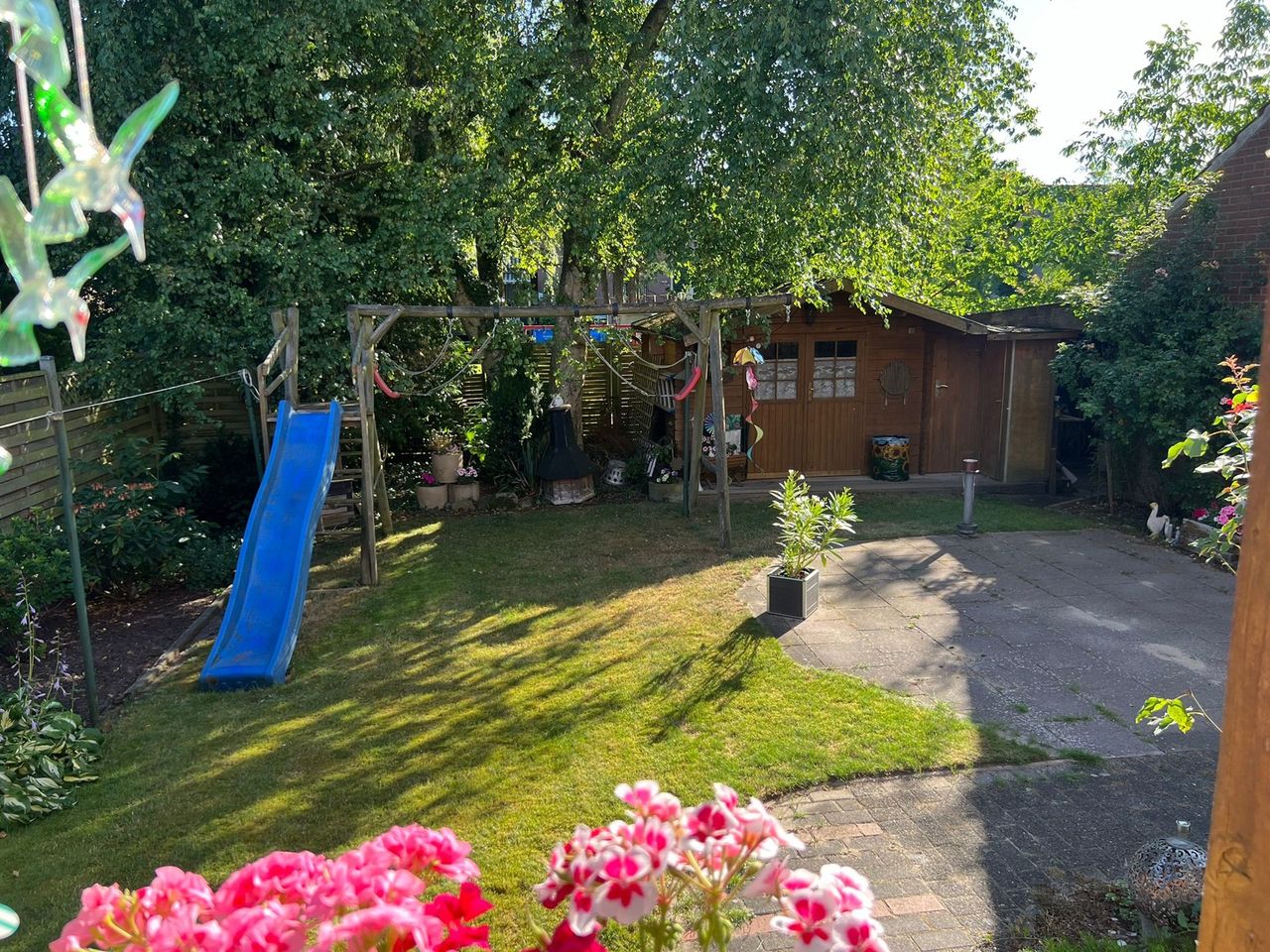 Das Erdgeschoß bietet mit einer Wohnfläche von ca. 78 m² eine Diele, Wohnzimmer, Eßzimmer, Badezimmer und zwei Schlafzimmer. Über die Küche gelangen Sie auf die überdachte Terrasse und den pflegeleichten Garten mit Gartenhäuschen.